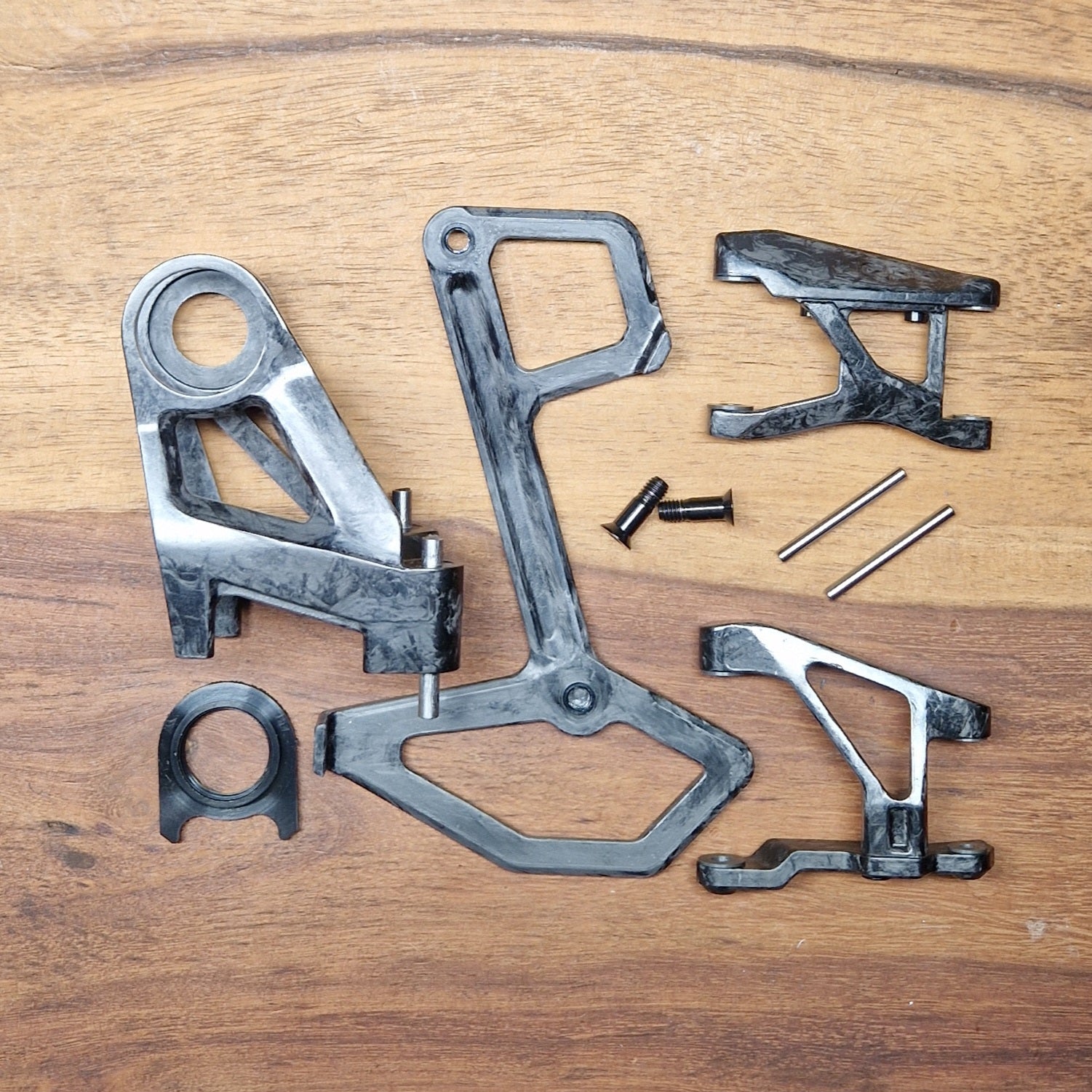 This stage DIY kit contains handmade carbon body front and rear plates, carbon cage, titanium pins for the p-knuckle and titanium knurled ring for the SRAM GX transmission rear derailleur. Bushings are included for easy installation. By using this kit you can achieve a weight saving of 109,5g.